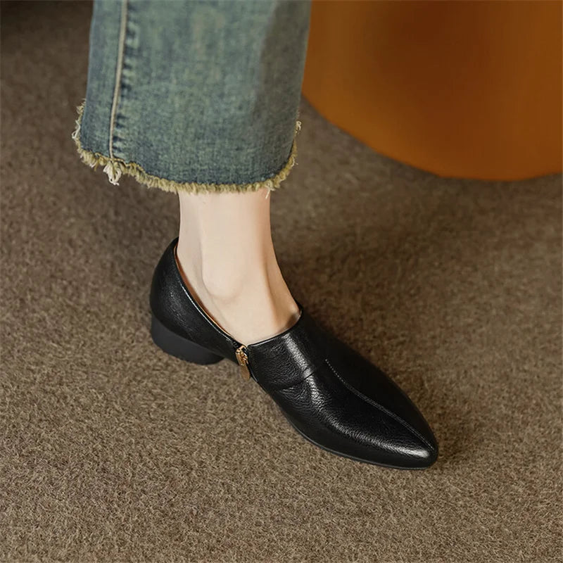 Su cremallera lateral no solo facilita el calce, sino que añade un detalle moderno y sofisticado.