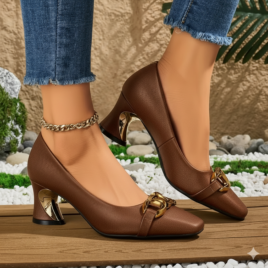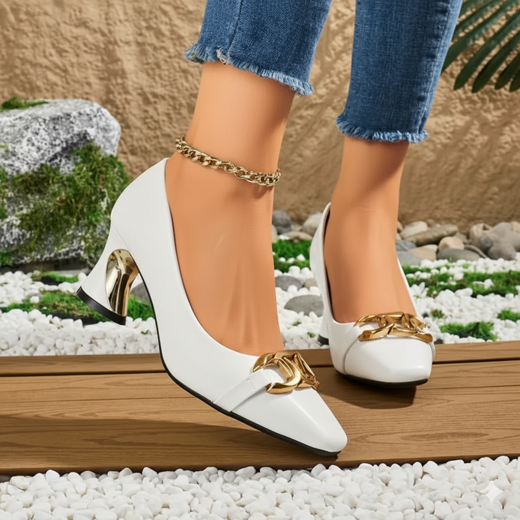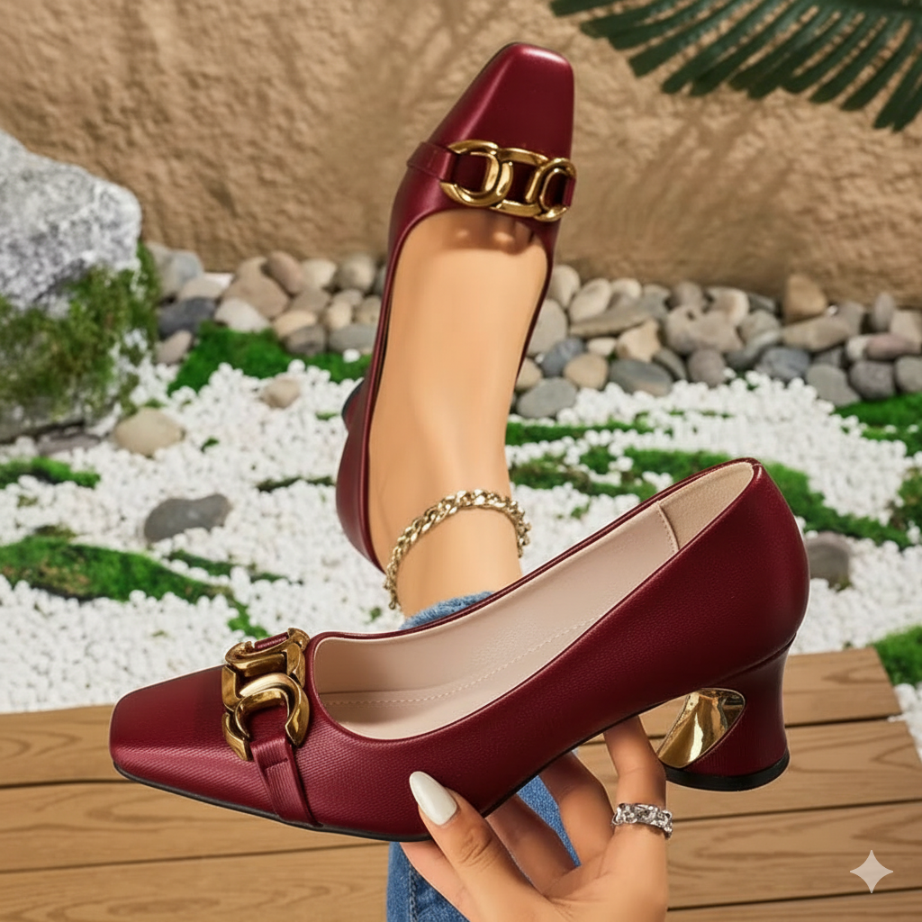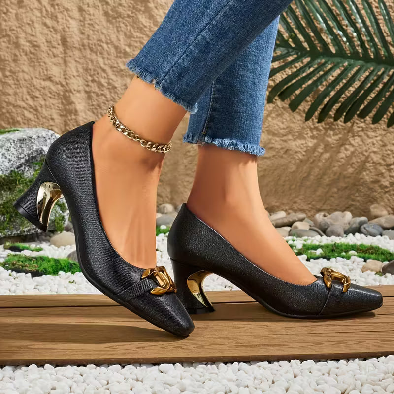 Estos zapatos Elara son una declaración de moda por sí mismos. Con su puntera cuadrada distintiva y un tacón escultural único, rompen con lo convencional y ofrecen una silueta moderna y audaz. La combinación de líneas limpias y detalles artísticos los convierte en una pieza clave para cualquier guardarropa contemporáneo.