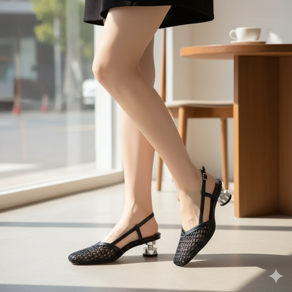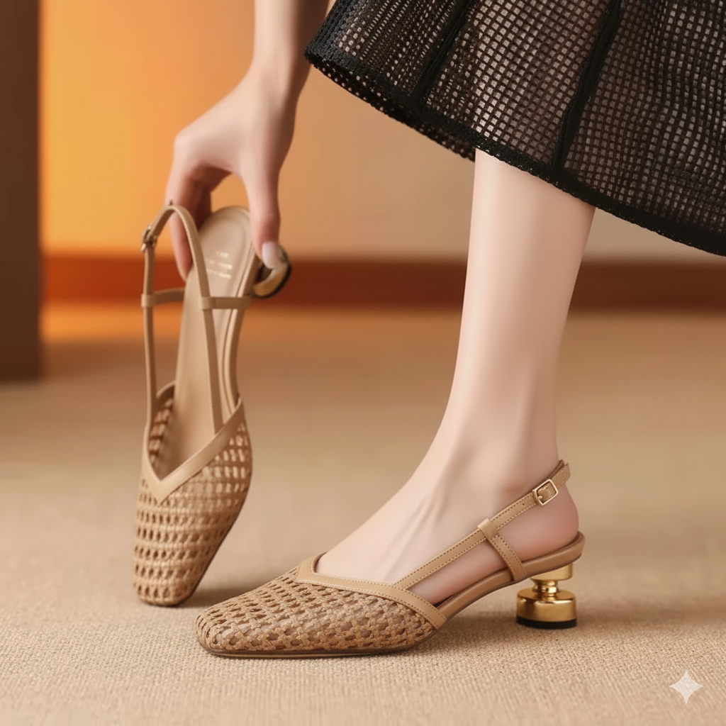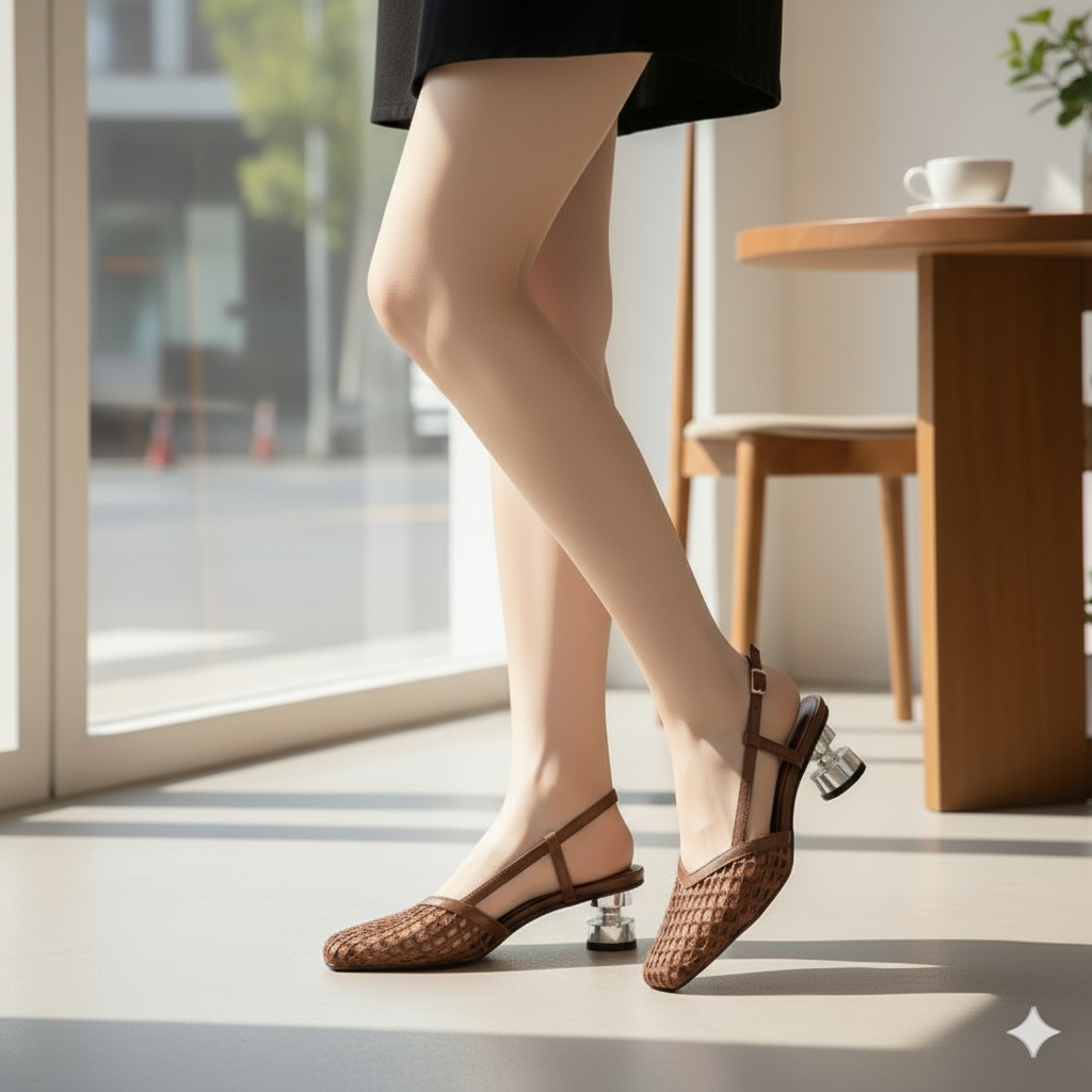 Su diseño entrelazado refleja originalidad y frescura. El tacón translúcido es una firma de distinción, una nota de audacia en un mundo que aplaude lo diferente.